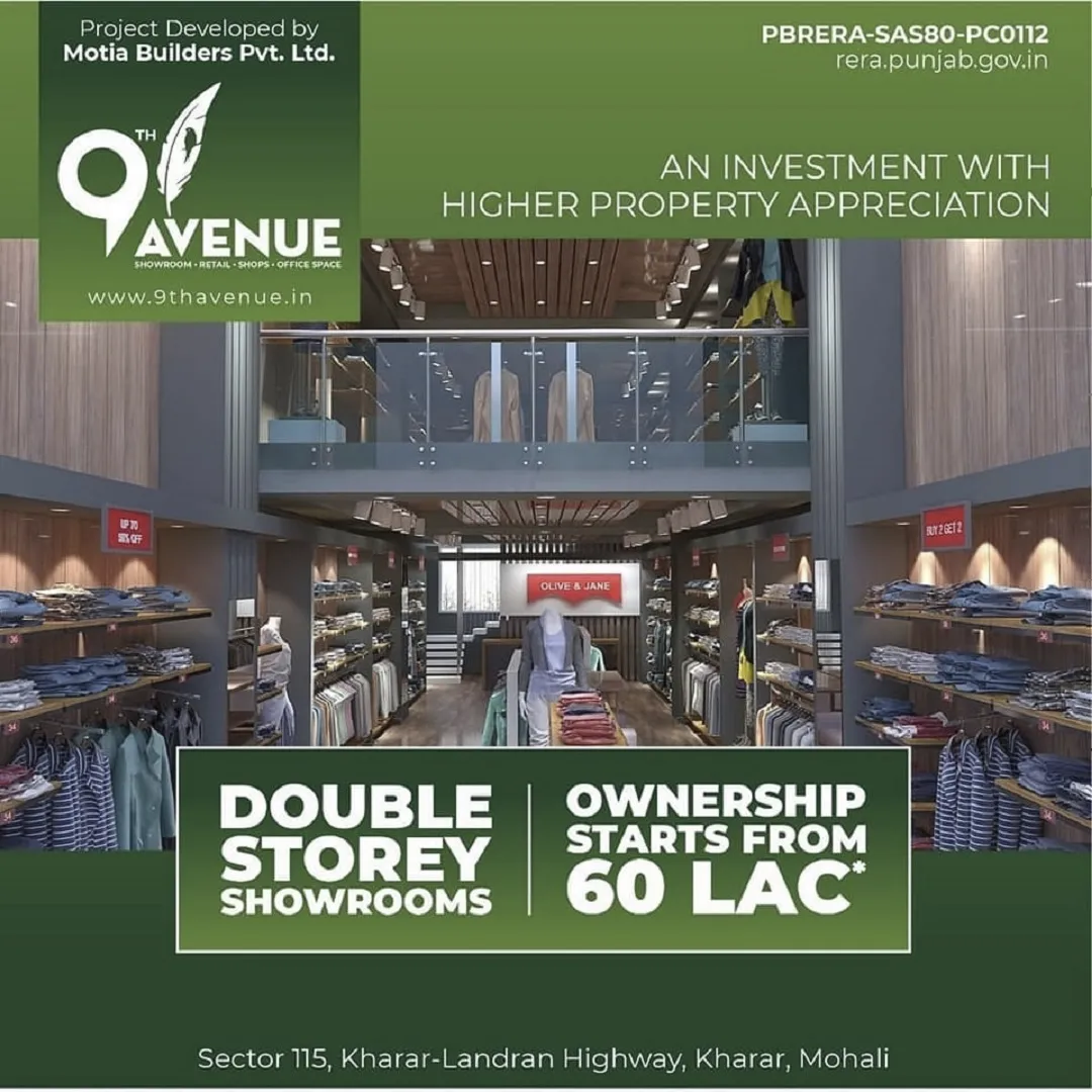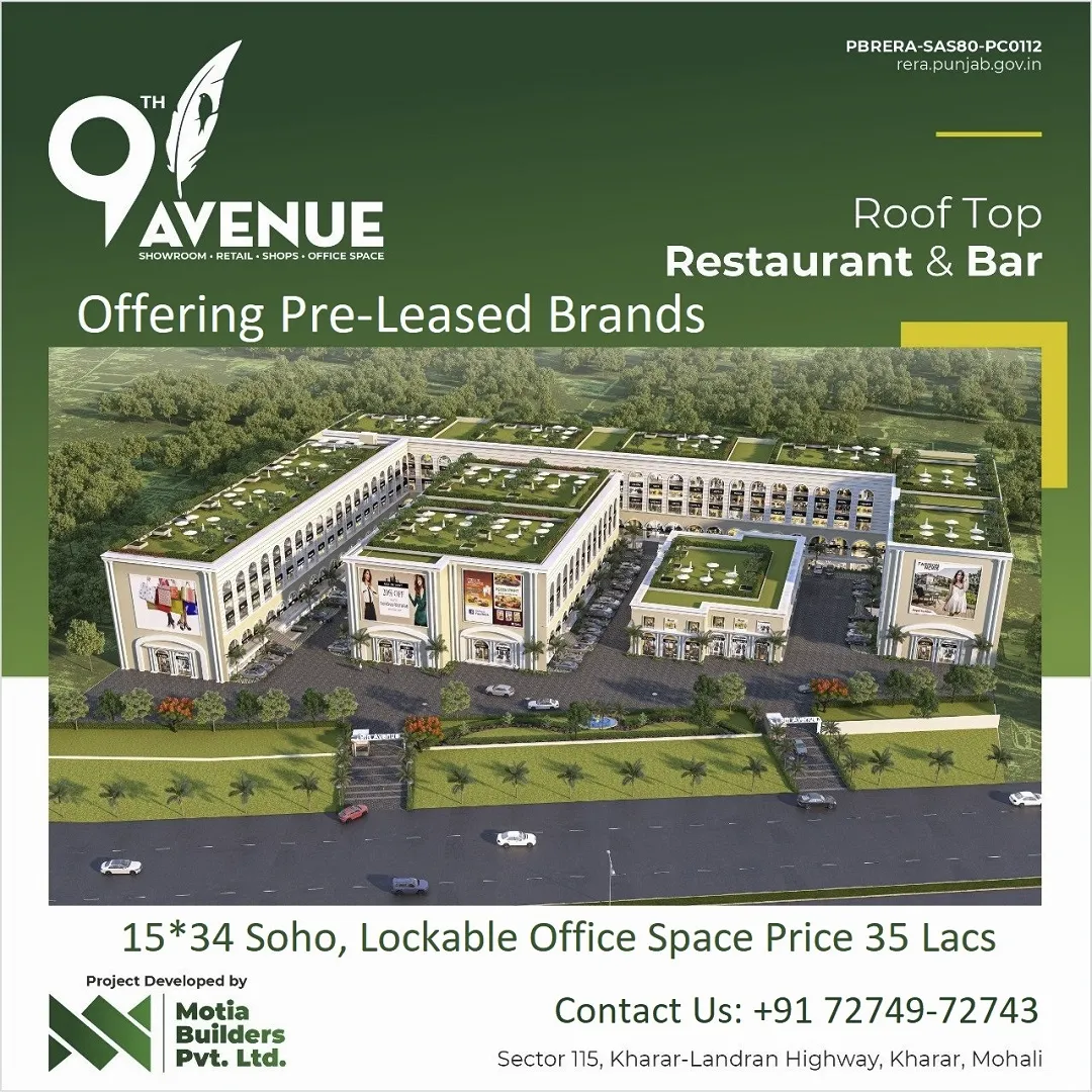 Motia Builders has 25 years of experience in real estate market during these glorious years company has delivered prestegious residential and commercial projects. and from past 15 years group has hard core experience in successfully delivering projects, delivering 50 Lakh sq.ft of the area. FIRST ORGANISED COMMERCIAL PROJECT IN GREATER MOHALI 9"Avenue is designed exclusively to become one of the most organised shopping & business destination in the Tricity. Every design & element is crafted to meet the highest standard & requirements of the urbanities, Till now, you were a step away from experiencing the ultimate commercial destination, however, 9" Avenue will take you to the new heights of shopping and work culture